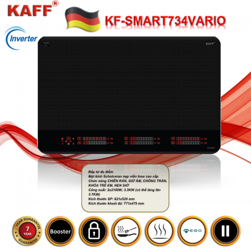 • Diện tích vùng nấu: Area 1: 2x2100W, 3.3KW (có thể tăng lên 3.7KW);