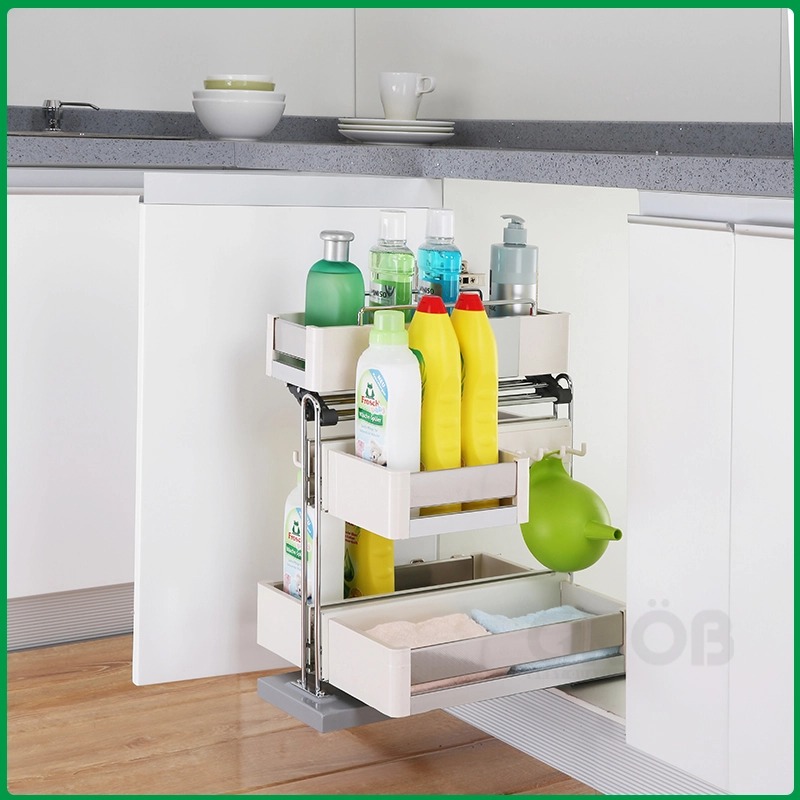 Giá đựng chất tẩy rửa là phụ kiện tủ bếp không thể thiếu trong căn bếp hiện đại ngày nay. Nổi bật với thiết kế thông minh giúp tận dụng khoảng không dưới chậu rửa, dùng để đựng chai lọ chất tẩy rửa, đây là giải pháp giúp không gian bếp ngăn nắp, gọn gàng, tăng tính thẩm mỹ.