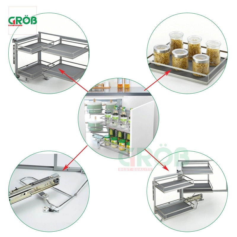 Giữ căn bếp ngăn nắp, dễ lấy đồ dùng: Thiết kế xoay và kéo ra hoàn toàn giúp bạn dễ dàng lấy đồ, không cần tìm kiếm lâu.