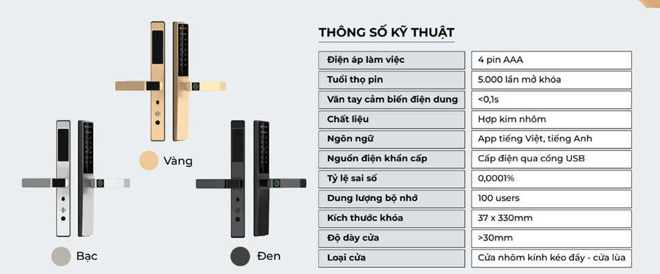 | Tuổi thọ pin | 5.000 lần mở khóa |